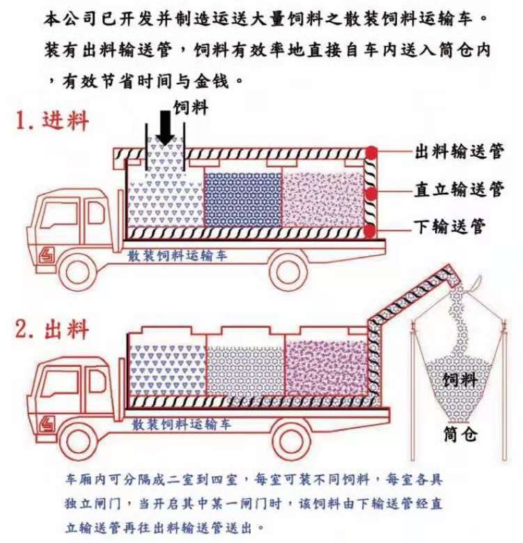 散裝飼料車的優(yōu)勢: 散裝飼料的生產(chǎn)可實現(xiàn)直接生產(chǎn)直接裝車,隨產(chǎn)隨出,不需要進(jìn)行提前備貨,不占用倉儲設(shè)施,也不會出現(xiàn)停產(chǎn)等待拉料的現(xiàn)象,使飼料生產(chǎn)實現(xiàn)計劃管理,生產(chǎn)效率得到提升。 ★獨有倒梯形設(shè)計,散裝飼料在罐體內(nèi)密封輸送,V字形罐體卸料順暢,減少飼料的耗損,保證質(zhì)量,避免污染。 ★運(yùn)輸比包裝成袋運(yùn)輸不但節(jié)省勞動力,而且成本較低。 ★可選電動卸料、全液壓卸料、氣卸為全自動上料卸料,可連續(xù)作業(yè),大大提高生產(chǎn)效率。 ★罐體內(nèi)可加裝分倉,可同時運(yùn)輸多種不同類的飼料或膨人介質(zhì)。部件標(biāo)準(zhǔn)化,容易維修保養(yǎng)。 頂部進(jìn)料倉