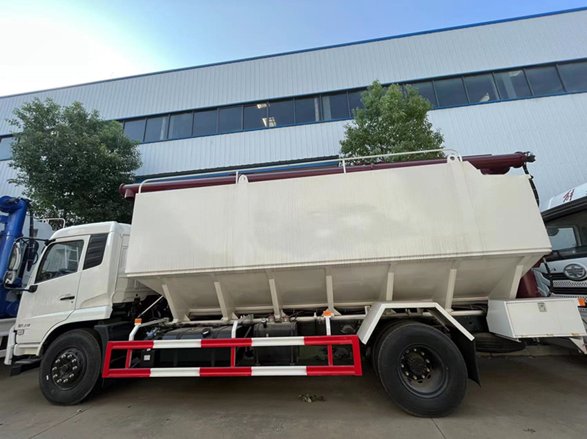 散裝飼料運(yùn)輸車,散裝飼料車的飼料罐架設(shè)在卡車的底盤上,罐頂開有進(jìn)料口.頂部的一根螺旋輸送卸料管(俗稱卸料絞龍)則可自由回轉(zhuǎn)和抬升,抬升的仰角可達(dá)60度。運(yùn)輸時(shí),頂部的螺旋管平臥在罐頂;卸料時(shí)則抬起,使管端的出料口與畜禽飼養(yǎng)場(chǎng)貯料罐頂部的進(jìn)料門相接,駕駛室內(nèi)裝有操縱裝置(操縱裝置也可裝置在罐體尾部),卸料時(shí)通過車底的動(dòng)力輸出軸和減速器來驅(qū)動(dòng)螺旋,以完成卸料。