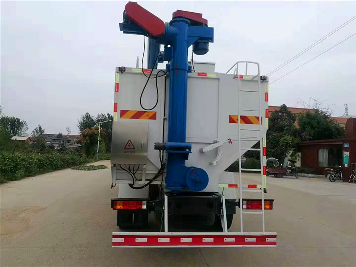 上裝罐體:罐體材質(zhì)采用4mm優(yōu)質(zhì)碳鋼板,整車3條絞龍,由3個(gè)5.5KW電機(jī)380V外接電源帶動(dòng),頂部絞龍用液壓控制舉升,可左右旋轉(zhuǎn)180°。罐體內(nèi)分為肆個(gè)倉(cāng),可以獨(dú)立控制各分倉(cāng)卸料順序和速度。