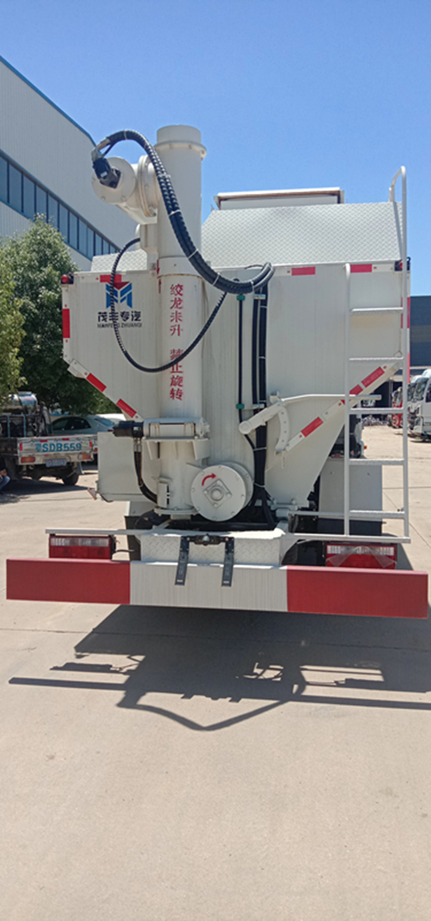 散裝飼料運(yùn)輸車,散裝飼料車的飼料罐架設(shè)在卡車的底盤上,罐頂開(kāi)有進(jìn)料口.頂部的一根螺旋輸送卸料管(俗稱卸料絞龍)則可自由回轉(zhuǎn)和抬升,抬升的仰角可達(dá)60度。運(yùn)輸時(shí),頂部的螺旋管平臥在罐頂;卸料時(shí)則抬起,使管端的出料口與畜禽飼養(yǎng)場(chǎng)貯料罐頂部的進(jìn)料門相接,駕駛室內(nèi)裝有操縱裝置(操縱裝置也可裝置在罐體尾部),卸料時(shí)通過(guò)車底的動(dòng)力輸出軸和減速器來(lái)驅(qū)動(dòng)螺旋,以完成卸料。