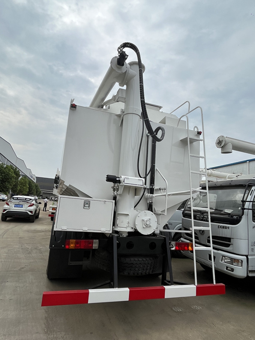 散裝飼料運輸車,散裝飼料車的飼料罐架設在卡車的底盤上,罐頂開有進料口.頂部的一根螺旋輸送卸料管(俗稱卸料絞龍)則可自由回轉(zhuǎn)和抬升,抬升的仰角可達60度。運輸時,頂部的螺旋管平臥在罐頂;卸料時則抬起,使管端的出料口與畜禽飼養(yǎng)場貯料罐頂部的進料門相接,駕駛室內(nèi)裝有操縱裝置(操縱裝置也可裝置在罐體尾部),卸料時通過車底的動力輸出軸和減速器來驅(qū)動螺旋,以完成卸料。